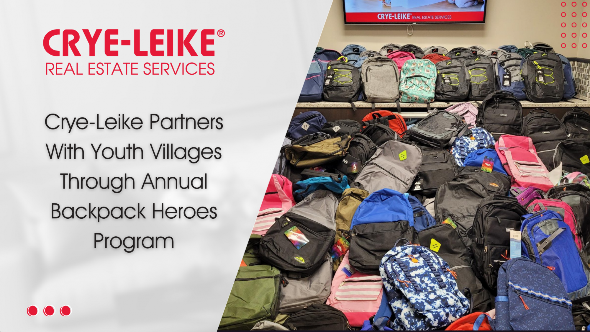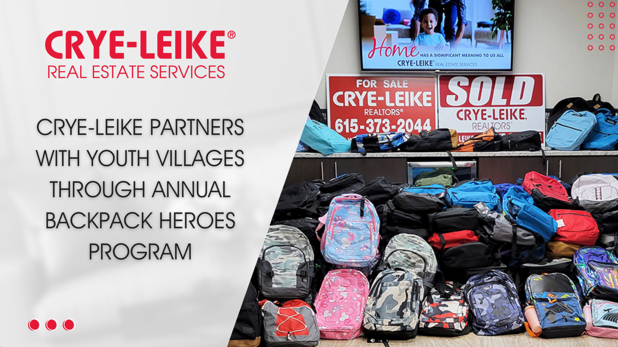 NASHVILLE, Tenn. — For 25 consecutive years, Crye-Leike Real Estate Services has partnered with Youth Villages of Middle Tennessee to support the Backpack Heroes program. Crye-Leike associates donated 310 backpacks filled with school supplies to Youth Villages, making this year's drive another success.
